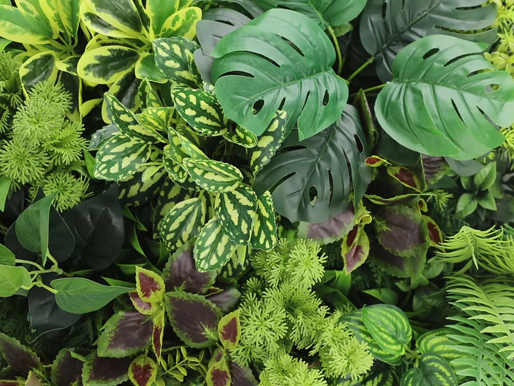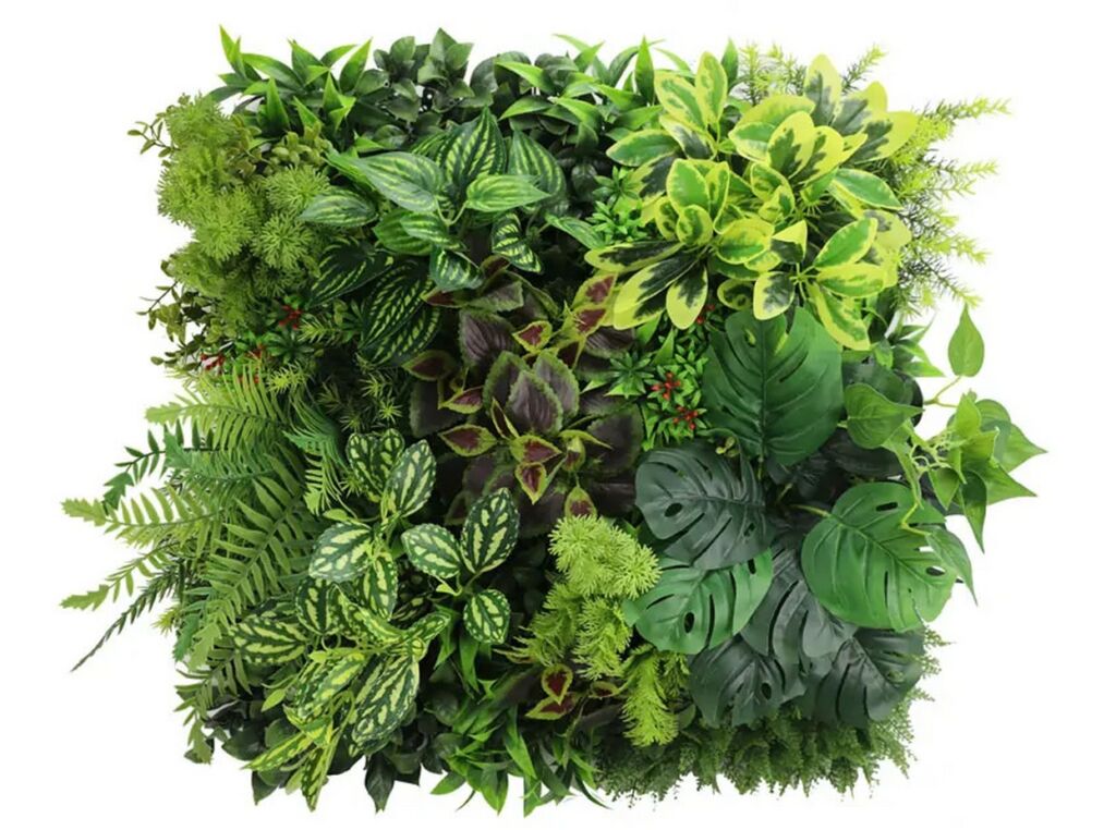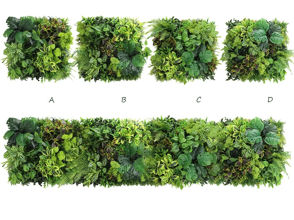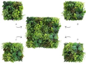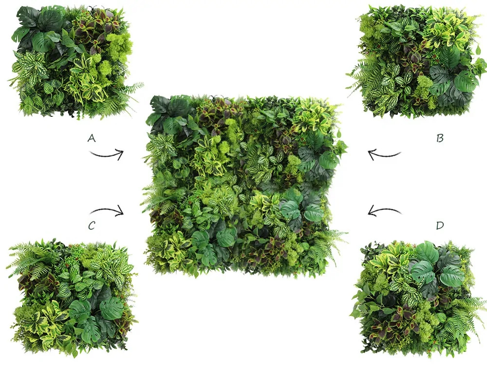 Díky různému rozložení rostlin na jednotlivých panelech lze vytvářet zajímavé a přirozené kombinace.Propracované detaily listů a květů dodávají rostlinám velmi realistický vzhled. Tato umělá zelená stěna je vhodná pouze pro vnitřní použití.