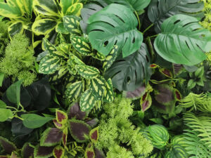 Panel zelené stěny tvořený mixem různých rostlin s rozmanitou barevností.