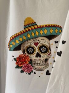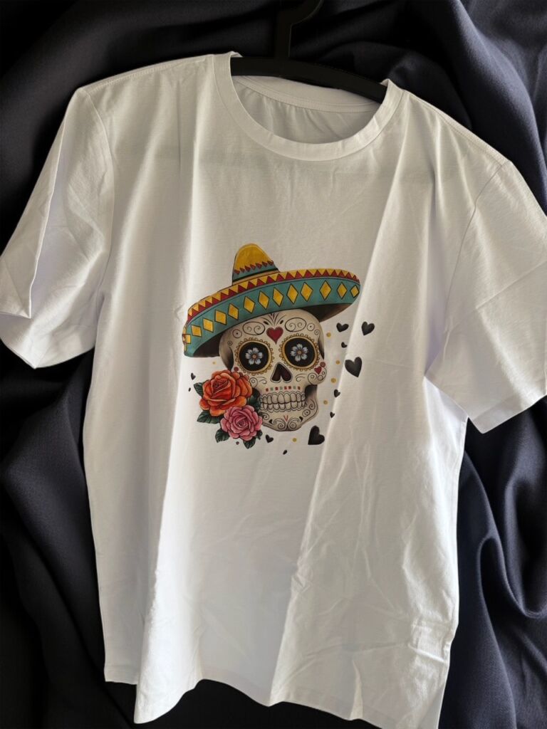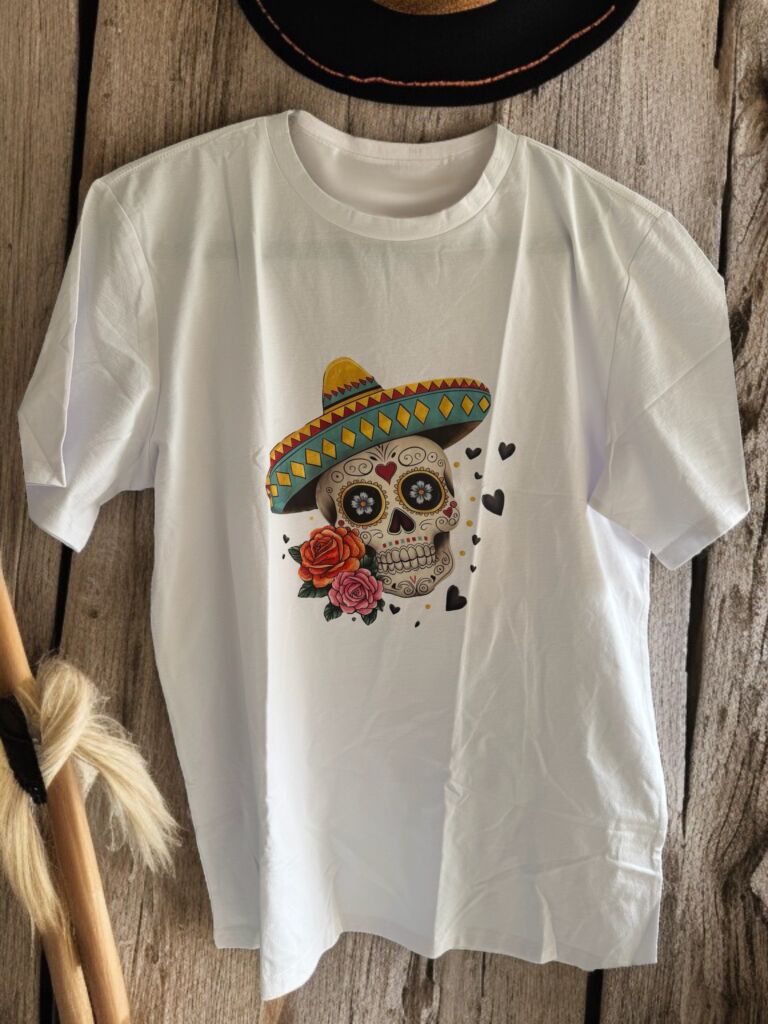 Bílé tričko s barevným potiskem sugar skull lebky.
