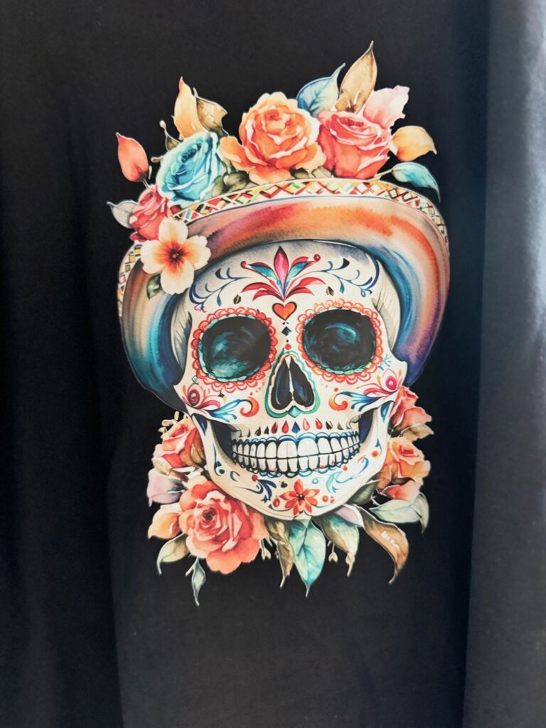 Bílé tričko s barevným potiskem sugar skull lebky.
