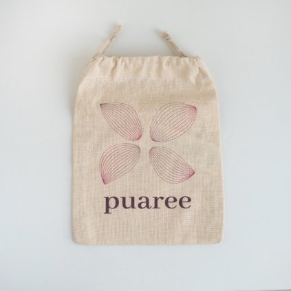 Plátěný pytlíček díky své velikosti se hodí do každé kabelky, můžete si do něj dát kosmetiku, drobnosti nebo třeba i svačinu. Využít ho můžete také jako dárkový pytlíček, do kterého zabalíte Puaree produkty. Pomocí šňůrek pytlíček zatáhnete, takže se nemusíte obávat, že by z něj něco vypadlo. Na pytlíčku je logo a symbol (květina Plumérie) Puaree.
