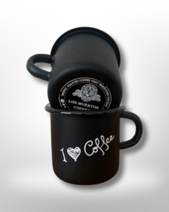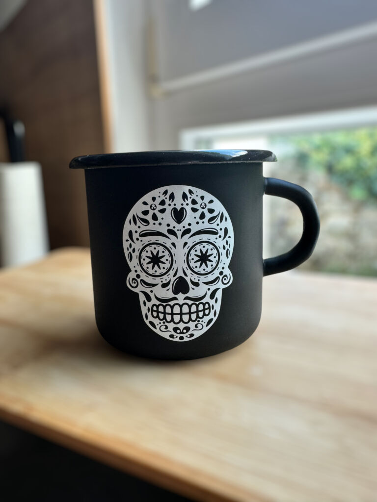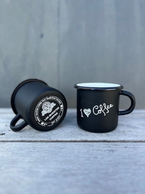 Plechový smaltovaný hrneček je skvělým doplňkem do Vaší kuchyně i na venkovní výpravy s kávou. Provedení hrnečku je černé matné s lesklým potiskem „I love coffee“ a sugar skull a logem na dně plecháčku.