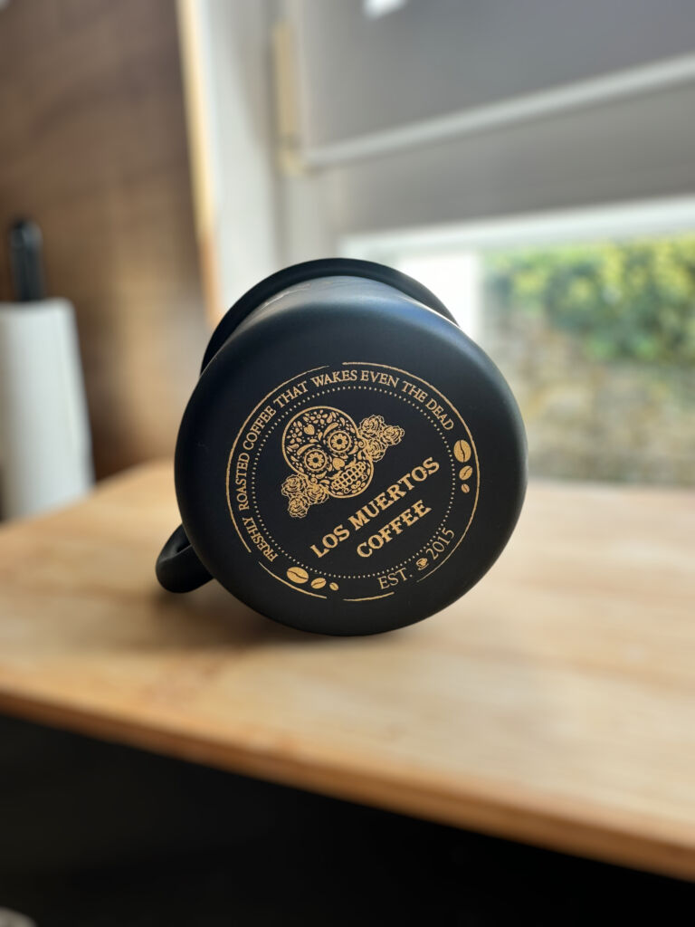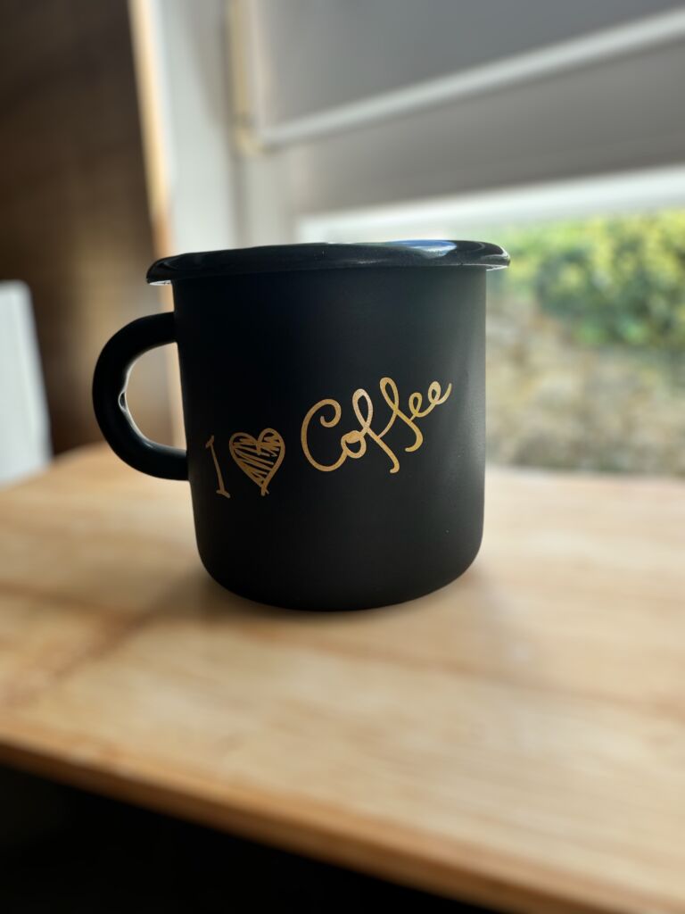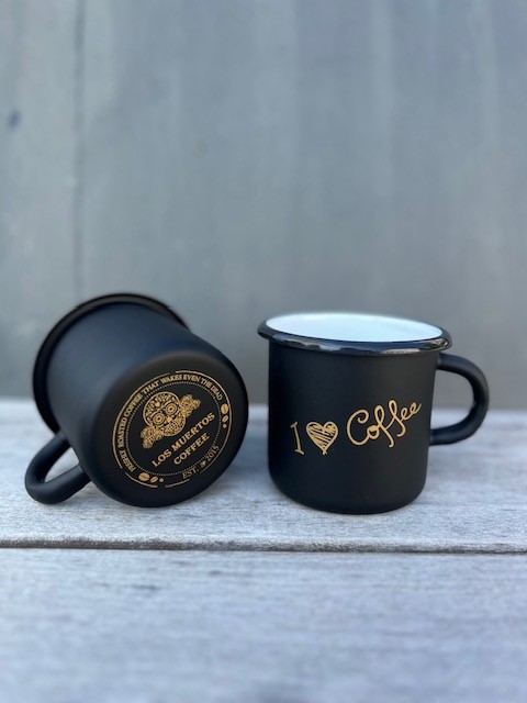 Plechový smaltovaný hrneček je skvělým doplňkem do Vaší kuchyně i na venkovní výpravy s kávou. Provedení hrnečku je černé matné s potiskem „I love coffee“, sugar skull lebkou a logem ze spodní strany.