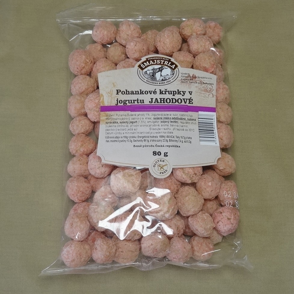 Bezlepkové pohankové křupky jemně potažené jahodovou jogurtovou polevou. 30 ks v balení
