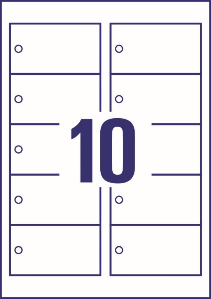 10 archů A4, rozměr 90x50 mm, 100 ks v balení vč. šňůrek pro uchycení, gramáž papíru 220 g/m2, hladké hrany Quick&Clean, oboustranný tisk, barva bílá. Typ tiskárny: černobílá laserová, barevná laserová.