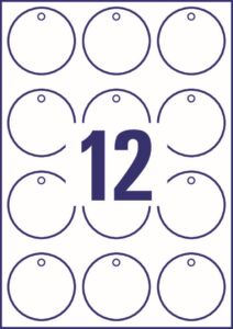10 archů A4, průměr 60 mm, 120 ks v balení vč. šňůrek pro uchycení, odolná PET fólie 190 µm, oboustranný tisk, barva bílá. Typ tiskárny: černobílá laserová, barevná laserová.