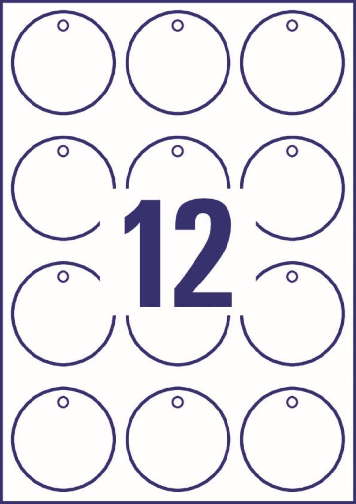 průměr 60 mm, 10 archů A4, 120 ks v balení (12 ks/arch), odolná PET fólie 190 µm, barva bílá. Typ tiskárny: černobílá laserová, barevná laserová.