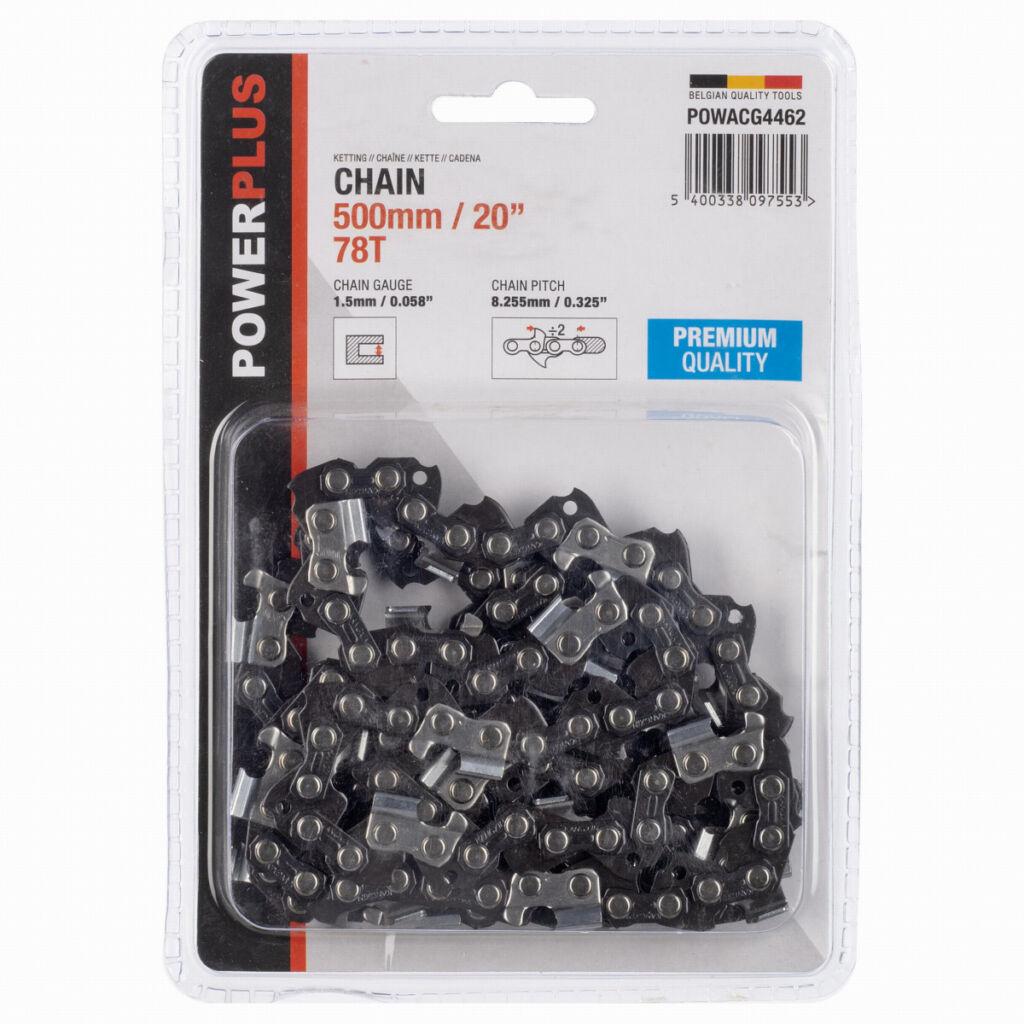 Pilový řetěz 20" (500mm) 78T - PREMIUM. Tento pilový řetěz POWACG4462 od PowerPlus prvotřídní kvality má vylepšenou geometrickou ostrost. Jeho otočné články eliminují tření a zaručují velmi čistý řez. Řetěz je kompatibilní s motorovou pilou Powerplus POWXG10231. Tímto vysoce kvalitním řetězem...