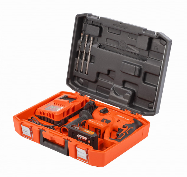 Výhodný SET POWDP15640 Aku kladiva, baterie 20V 2.000mAh Li-Ion, nabíječky a to vše v praktickém kufru. Toto aku kombinované kladivo POWERPLUS POWDP15630 20V můžete použít k vrtání, příklepovému vrtání a sekání do dřeva, kamene, oceli nebo cihel. Díky efektivnímu bezuhlíkovému motoru je nástroj mimořádně odolný a poskytuje mu sílu nárazu 3 J. Lze jej použít pro vrtání do tvrdších materiálů i pro lehčí sekání. Pohodlná práce je zaručena díky nízké úrovni vibrací a měkkému uchopení, které perfektně padne do vaší ruky. Díky praktickému pracovnímu světlu není práce v tmavých prostorách žádný problém a protiprachová krytka chrání před znečištěním vašeho stroje. Zahrnuty jsou tři vrtáky a plochý a špičatý sekáč, takže můžete začít pracovat okamžitě. Použít můžete baterie ze série DUAL POWER o napětí 20V a také i baterie o napětí 40V. Doporučujeme použít 40V baterii, která vám nabízí optimální provozní dobu.