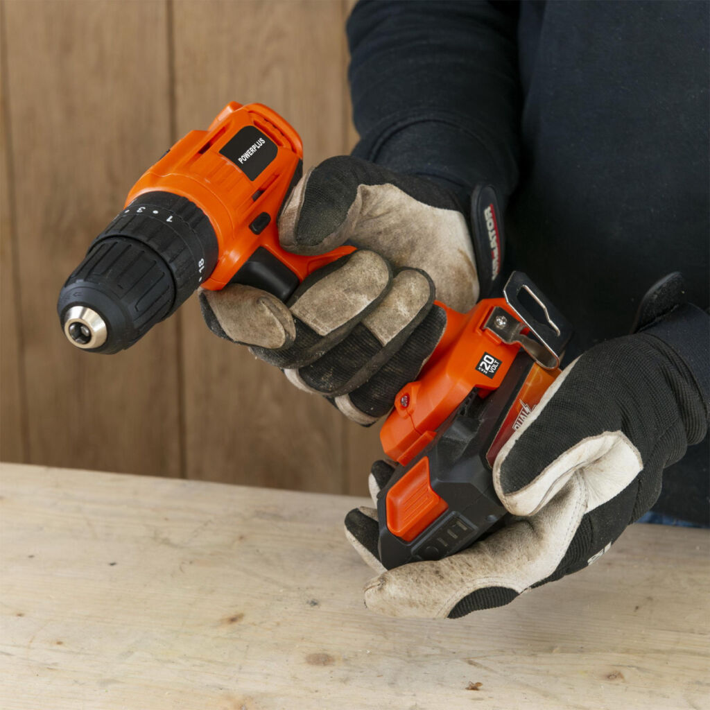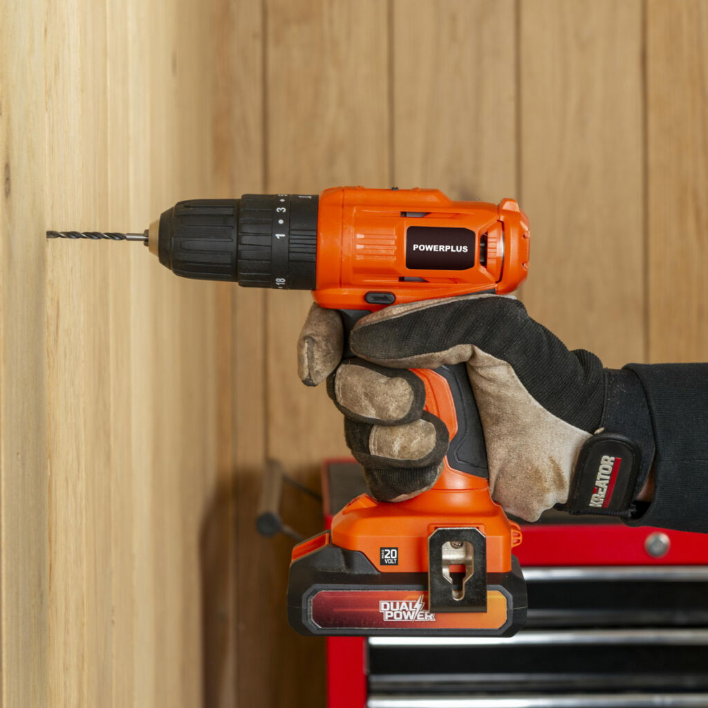 Tato AKU 20V příklepová vrtačka/šroubovák POWDPO1100 od Powerplus je ideální pro ty příležitostné domácí kutilské projekty, které vyžadují šrouby nebo (příklepové) vrtání. Tato příklepová vrtačka/šroubovák je kompaktní elektrické nářadí, které lze použít jak pro vrtání, tak pro šroubování. Bez námahy s ním vrtáte až 20 mm do dřeva, 10 mm do oceli a 6 mm do kamene. Vyberte si mezi 2 různými nastaveními rychlosti a 18 nastaveními točivého momentu, abyste plně přizpůsobili nástroj vašemu projektu. Nejvyšší nastavení otáček (0 min-1 – 1500 min-1) je pro vrtání a nižší otáčky (0 min-1 – 400 min-1) pro šroubování. Pokud se něco pokazí, rychlé zastavení okamžitě vypne nářadí, aby byl zajištěn bezpečný provoz za všech okolností. Ochrana proti přetížení zabraňuje přehřátí a přetížení elektromotoru. Automaticky vypne motor, když dojde k prudkému zvýšení teploty. Výměna vrtáků nebo šroubovacích bitů je rychlá díky rychloupínacímu sklíčidlu. Stroj je dodáván bez baterie a nabíječky. Použít můžete baterie ze série DUAL POWER o napětí 20V a také i baterie o napětí 40V. Použití 40V baterie zajišťuje ještě delší dobu chodu stroje ve srovnání s 20V verzí.