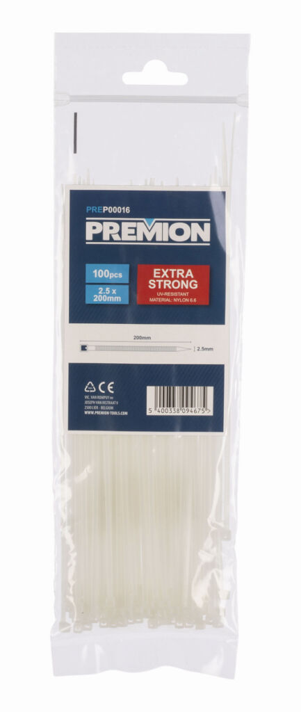 Tato sada PREP00016 od Premion obsahuje 100 ks bílých nylonových stahovacích pásek 2,5 x 200 mm. Tyto extra pevné stahovací pásky mají vysokou pevnost v tahu. Použijte je k úhlednému svázání kabelů nebo ke snadnému vzájemnému spojení předmětů. Úhledně ukryjte kabely a vodiče například ve své kanceláři nebo dílně tím, že je svážete pomocí těchto kabelových stahovacích pásků. Navíc jsou tyto stahovací pásky odolné vůči UV záření.