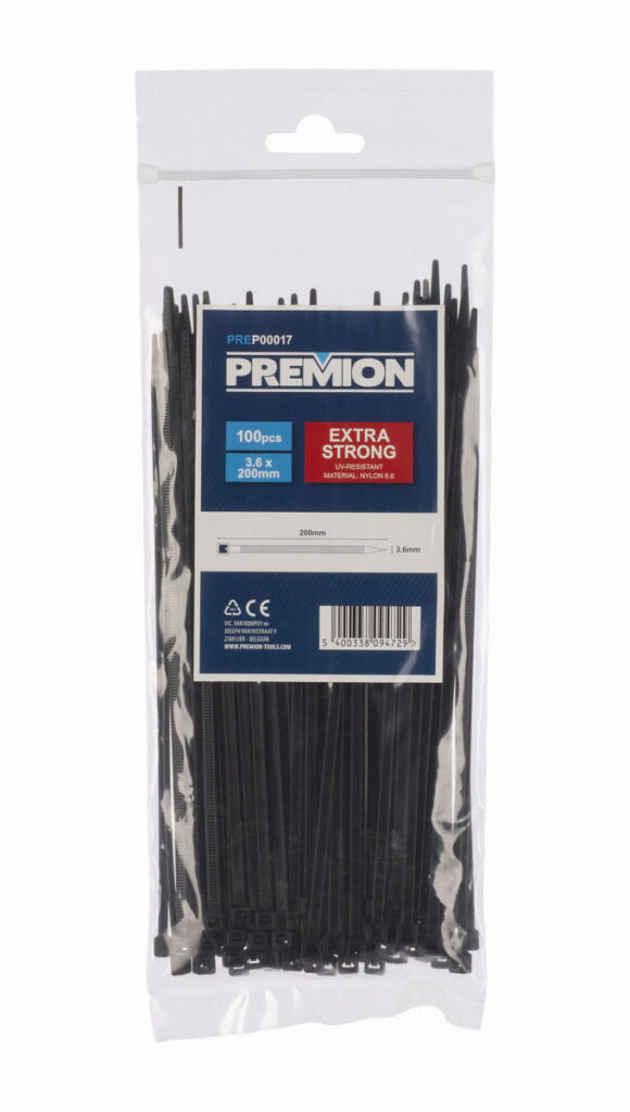 Tato sada PREP00017 od Premion obsahuje 100 ks černých nylonových stahovacích pásek 3,6 x 200 mm. Tyto extra pevné stahovací pásky mají vysokou pevnost v tahu. Použijte je k úhlednému svázání kabelů nebo ke snadnému vzájemnému spojení předmětů. Úhledně ukryjte kabely a vodiče například ve své kanceláři nebo dílně tím, že je svážete pomocí těchto kabelových stahovacích pásků. Navíc jsou tyto stahovací pásky odolné vůči UV záření.