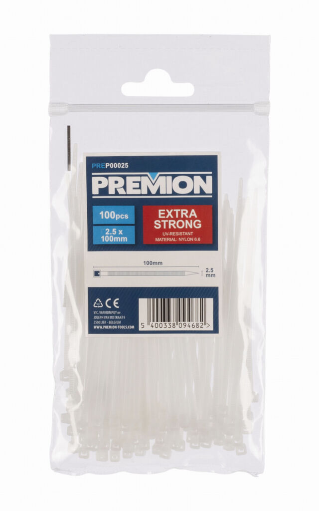 Tato sada PREP00025 od Premion obsahuje 100 ks bílých nylonových stahovacích pásek 2,5 x 100 mm. Tyto extra pevné stahovací pásky mají vysokou pevnost v tahu. Použijte je k úhlednému svázání kabelů nebo ke snadnému vzájemnému spojení předmětů. Úhledně ukryjte kabely a vodiče například ve své kanceláři nebo dílně tím, že je svážete pomocí těchto kabelových stahovacích pásků. Navíc jsou tyto stahovací pásky odolné vůči UV záření.
