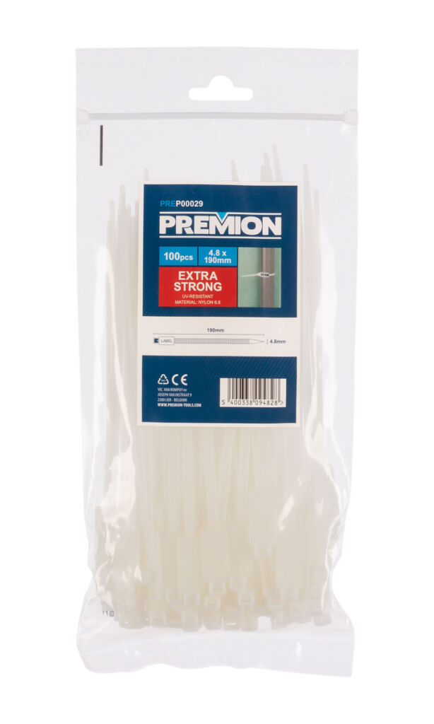 Tato sada PREP00029 od Premion obsahuje 100 ks bílých nylonových stahovacích pásek 4,8 x 190 mm s popisným štítkem. Tyto extra pevné stahovací pásky mají vysokou pevnost v tahu. Použijte je k úhlednému svázání kabelů nebo ke snadnému vzájemnému spojení předmětů. Úhledně ukryjte kabely a vodiče například ve své kanceláři nebo dílně tím, že je svážete pomocí těchto kabelových stahovacích pásků. Navíc jsou tyto stahovací pásky odolné vůči UV záření.