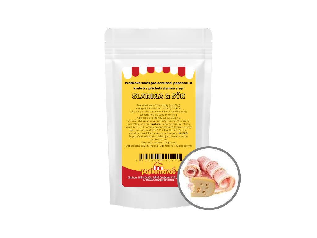 Prášková směs pro ochucení popcornu a krekrů s příchutí slanina a sýr, balení 200g Můžete také zakoupit ve výhodnějším balení: Příchuť na popcorn a krekry Slanina & sýr (1kg)