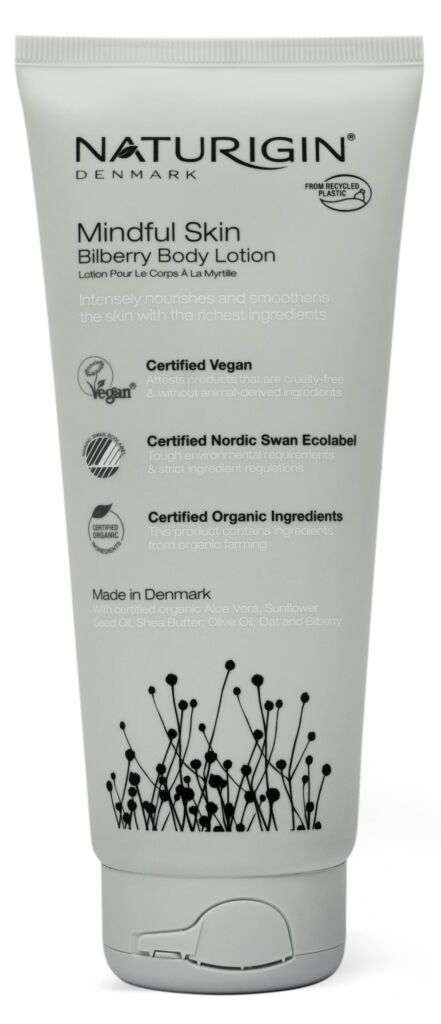 Dánská přírodní kosmetika NATURIGIN neobsahuje SLS a parabeny. Přírodní BIO ingredience pocházejí z certifikovaných zdrojů. Hydratační tělové mléko NATURIGIN Mindful Skin Bilberry Body Lotion získalo certifikaci Nordic Swan Ecolabel, logo Vegan a certifikaci Certified Organic Ingredients.