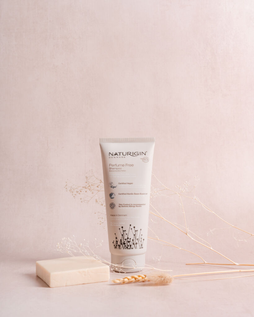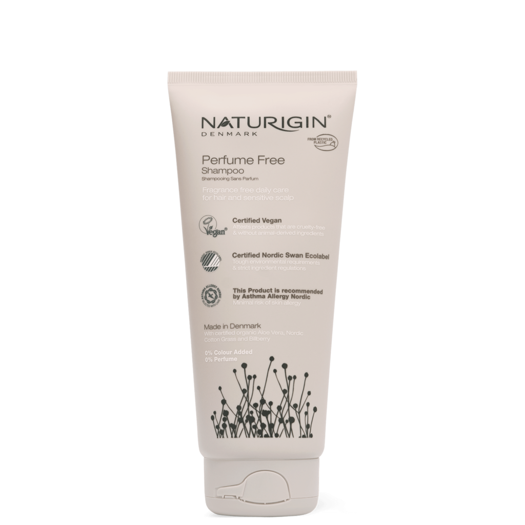 Dánská přírodní kosmetika NATURIGIN neobsahuje SLS, parabeny ani amoniak. Přírodní BIO ingredience pocházejí z certifikovaných zdrojů. Šampon pro citlivou pokožku NATURIGIN Perfume Free Shampoo získal certifikace Asthma Allergy Nordic a Nordic Swan Ecolabel, logo Vegan a certifikaci Certified Organic Ingredients.