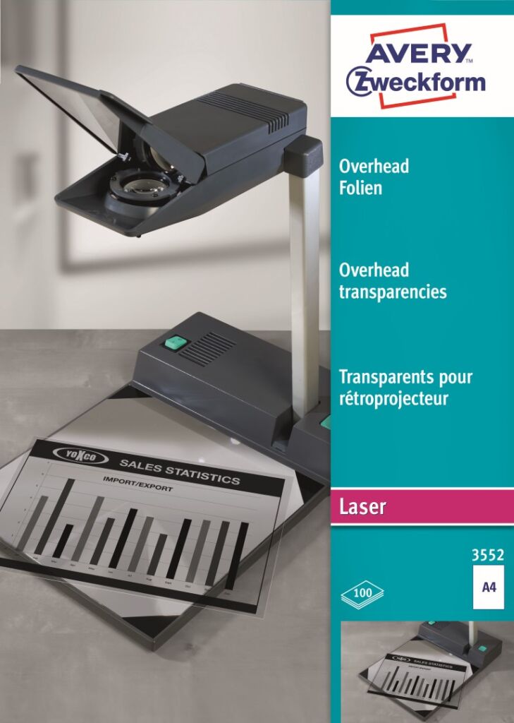 Projektorová fólie Avery Zweckform 3552 je ideální na jednoduchou a rychlou přípravu prezentace, školení nebo přednášky pomocí zpětného projektoru. Tepelně stabilní polyesterová fólie do projektorů má speciální oboustrannou antistatickou povrchovou úpravu pro ostré kontury tisku a vynikající přilnavost toneru, zabraňující rozmazávání. Fólie stačí jednoduše vložit do zásobníku na papír a bez problémů můžete potisknout i větší počet fólií najednou. Fólie pro zpětné projektory Avery 3552 jsou vhodné pro všechny běžné černobílé laserové tiskárny a kopírovací stroje.