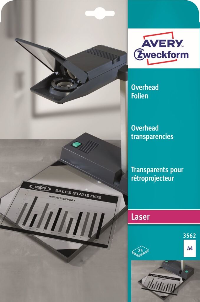 Projektorová fólie Avery Zweckform 3562 je ideální na jednoduchou a rychlou přípravu prezentace, školení nebo přednášky pomocí zpětného projektoru. Tepelně stabilní polyesterová fólie do projektorů má speciální jednostrannou antistatickou povrchovou úpravu pro ostré kontury tisku a vynikající přilnavost toneru, zabraňující rozmazávání. Fólie stačí jednoduše vložit do zásobníku na papír a bez problémů můžete potisknout i větší počet fólií najednou. Fólie pro zpětné projektory Avery 3562 jsou vhodné pro všechny běžné černobílé laserové tiskárny a kopírovací stroje.