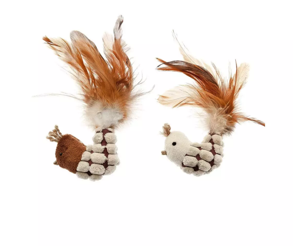 Hračky pro kočky prodávané v párech ve tvaru ptáčků.