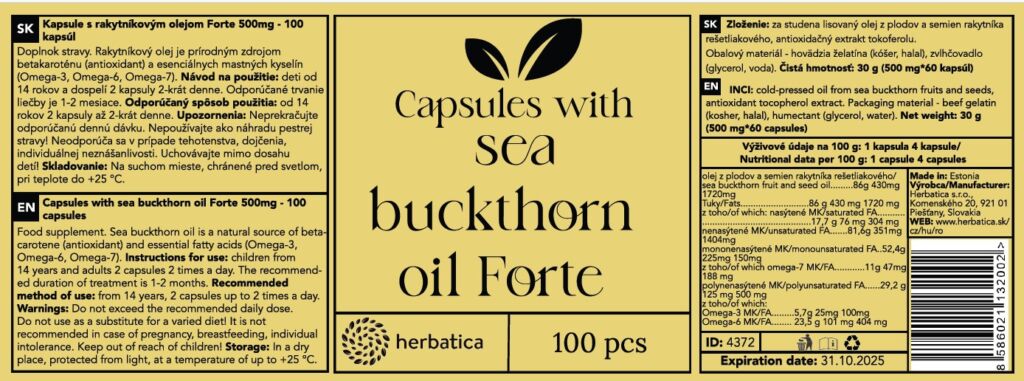 Olej z plodů a semen rakytníku řešetlákového: 86g / 430mg / 1720mg