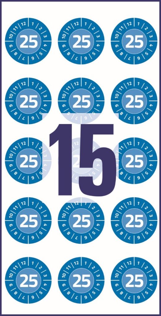 průměr 20 mm, 120 ks etiket v balení, vinylová fólie, permanentní lepidlo, barva modrá se symboly číslic měsíců 1-12 a letopočtu 2025.