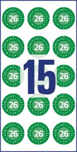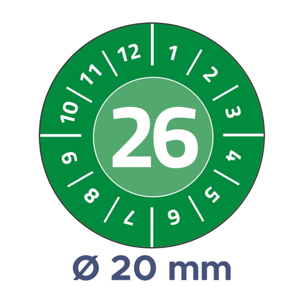 průměr 20 mm, 120 ks etiket v balení, vinylová fólie, permanentní lepidlo, barva zelená se symboly číslic měsíců 1-12 a letopočtu 2026.