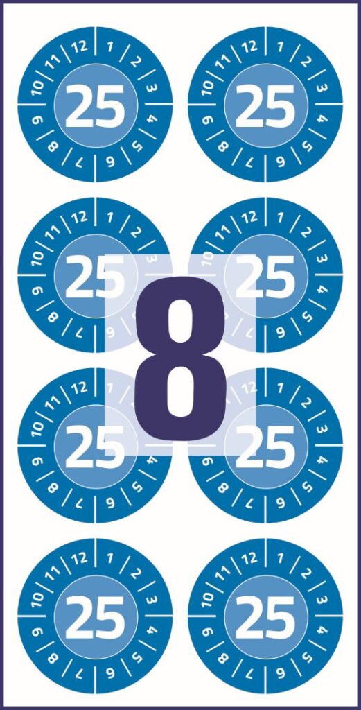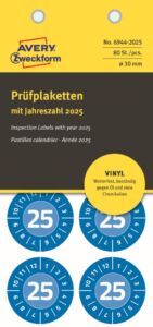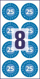 průměr 30 mm, 80 ks etiket v balení, vinylová fólie, permanentní lepidlo, barva modrá se symboly číslic měsíců 1-12 a letopočtu 2025.