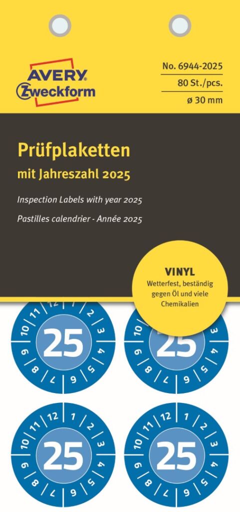 Předtištěné samolepící štítky Avery Zweckform 6944-2025 jsou ideální jako revizní nebo inspekční štítky, trvalé kontrolní označování, bezpečnostní a údržbové značení inventáře, majetku atd. Vysoká odolnost a silná přilnavost na různých površích. Nálepky jsou velmi přehledné, poskytují potřebné informace na první pohled a fungují i v mezinárodním měřítku. Vynilové samolepky jsou odolné vůči stříkající vodě, oleji, rozpouštědlům, čistícím a desinfekčním prostředkům a teplotám od -20°C do +80°C. Díky tomu jsou vhodné i do extrémních a náročných venkovních podmínek. Modré inspekční štítky pro ruční popis Avery 6944-2025 lze použít obzvláště snadno a přímo na místě pomocí permanentního popisovače, nůžek, děrovacích kleští apod. Baleno v praktickém bločku.