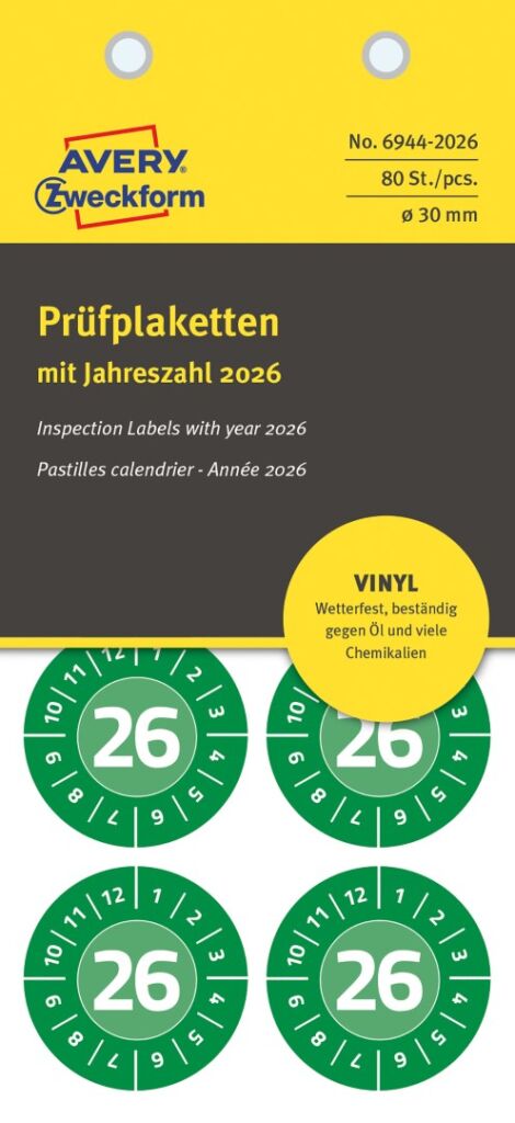 Předtištěné samolepící štítky Avery Zweckform 6944-2026 jsou ideální jako revizní nebo inspekční štítky, trvalé kontrolní označování, bezpečnostní a údržbové značení inventáře, majetku atd. Vysoká odolnost a silná přilnavost na různých površích. Nálepky jsou velmi přehledné, poskytují potřebné informace na první pohled a fungují i v mezinárodním měřítku. Vynilové samolepky jsou odolné vůči stříkající vodě, oleji, rozpouštědlům, čistícím a desinfekčním prostředkům a teplotám od -20°C do +80°C. Díky tomu jsou vhodné i do extrémních a náročných venkovních podmínek. Zelené revizní štítky pro ruční popis Avery 6944-2026 lze použít obzvláště snadno a přímo na místě pomocí permanentního popisovače, nůžek, děrovacích kleští apod. Baleno v praktickém bločku.
