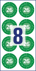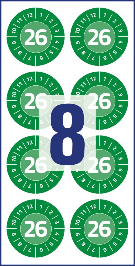 průměr 30 mm, 80 ks etiket v balení, vinylová fólie, permanentní lepidlo, barva zelená se symboly číslic měsíců 1-12 a letopočtu 2026.