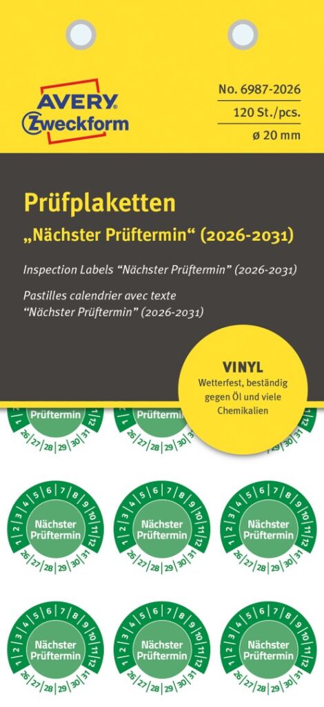 průměr 20 mm, 120 ks etiket v balení, vinylová fólie, permanentní lepidlo, barva zelená s nápisem “Nächster Prüftermin“, číslicemi měsíců 1-12 a letopočtů 2026-2031.
