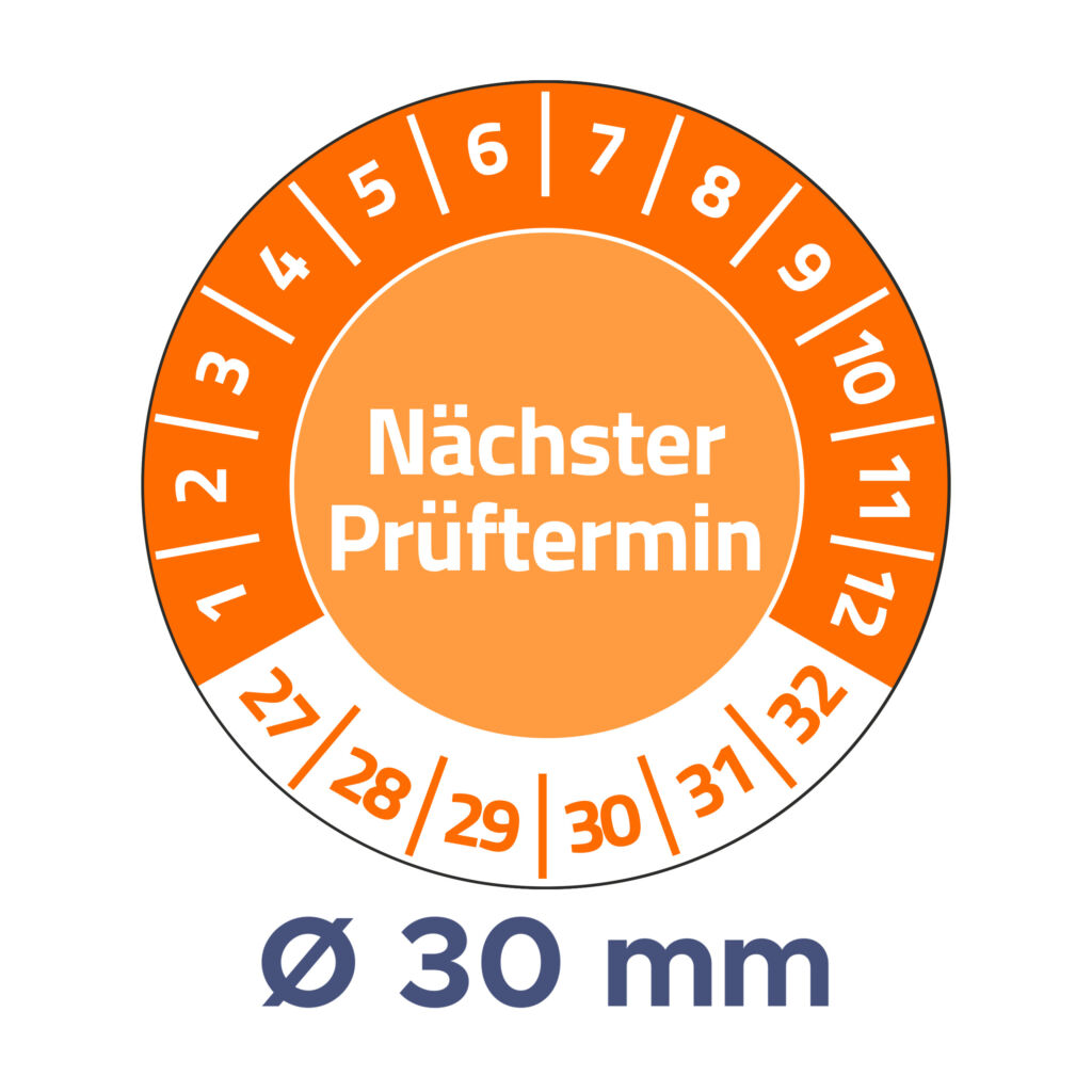 průměr 30 mm, 80 ks etiket v balení, odolná vinylová fólie, permanentní lepidlo, barva oranžová s nápisem ''Nächster Prüftermin'', symboly číslic měsíců 1-12 a letopočtů 2027-32.