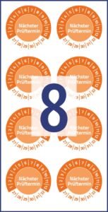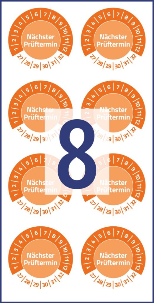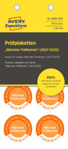 průměr 30 mm, 80 ks etiket v balení, vinylová fólie, permanentní lepidlo, barva oranžová s nápisem “Nächster Prüftermin“, číslicemi měsíců 1-12 a letopočtů 2027-2032.