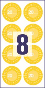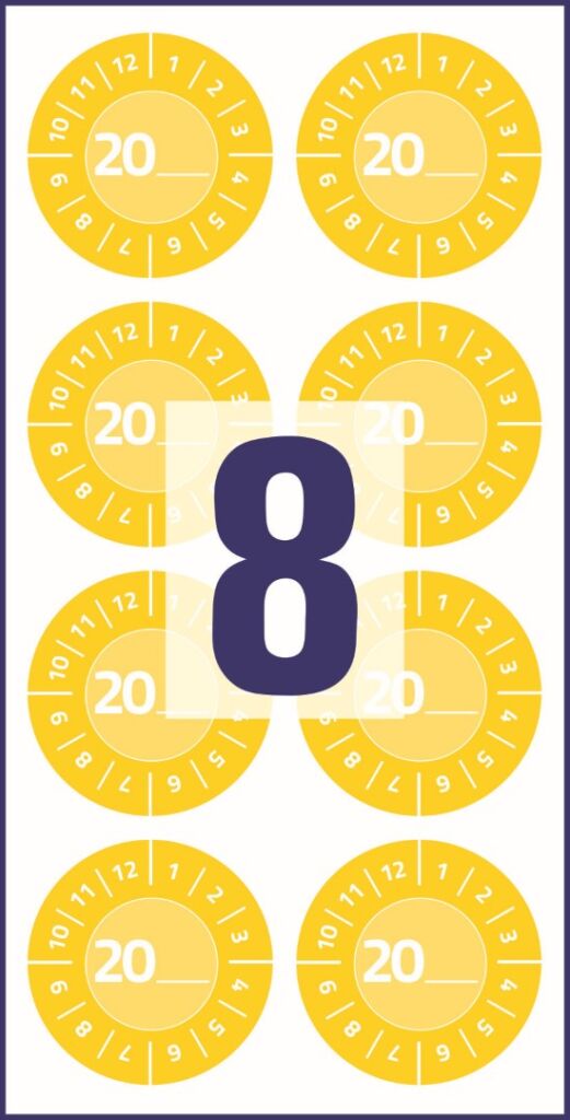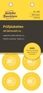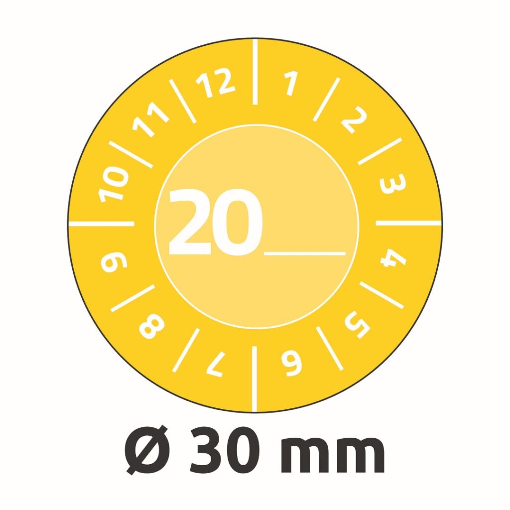 průměr 30 mm, 80 ks etiket v balení, vinylová fólie, permanentní lepidlo, barva žlutá s číslicemi měsíců 1-12 a volitelného letopočtu 20xx.