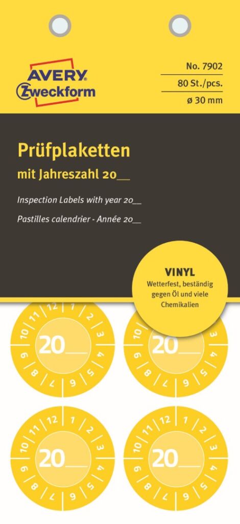 Předtištěné samolepící štítky na ruční popis Avery Zweckform 7902 jsou ideální jako revizní nebo inspekční štítky, trvalé kontrolní značení, bezpečnostní a údržbové označování inventáře, majetku atd. Vysoká odolnost a silná přilnavost na různých površích. Kontrolní nálepky jsou velmi přehledné, poskytují potřebné informace na první pohled a fungují i v mezinárodním měřítku. Vynilové samolepky jsou odolné vůči stříkající vodě, oleji, rozpouštědlům, čistícím a desinfekčním prostředkům a teplotám od -20°C do +80°C. Díky tomu jsou vhodné i do extrémních a náročných venkovních podmínek. Žluté revizní štítky o průměru 30 mm Avery 7902 lze použít obzvláště snadno a rychle přímo na místě pomocí permanentního popisovače a nůžek nebo děrovacích kleští. Baleno v praktickém bločku.