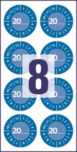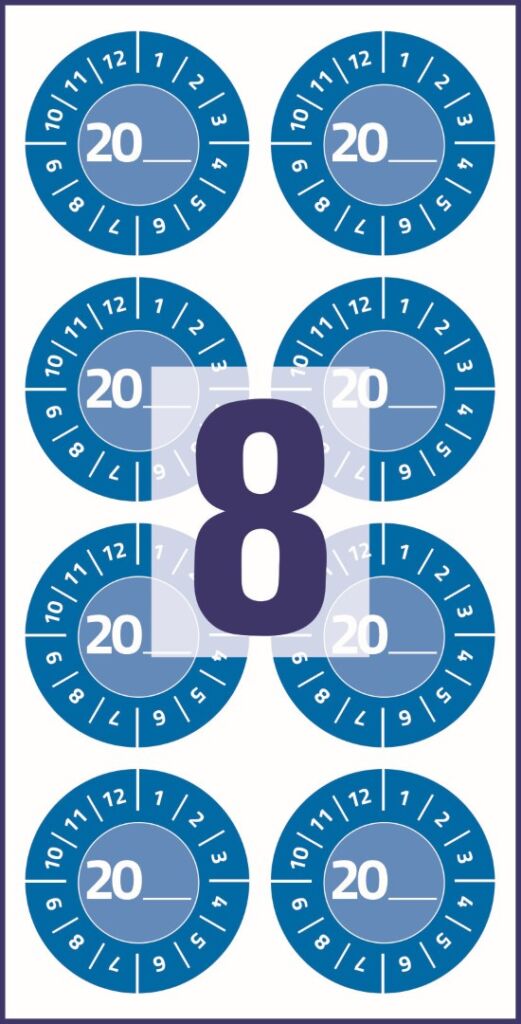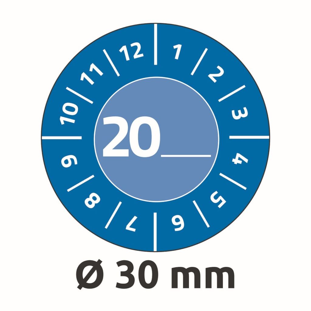 průměr 30 mm, 80 ks etiket v balení, vinylová fólie, permanentní lepidlo, barva modrá s číslicemi měsíců 1-12 a volitelného letopočtu 20xx.