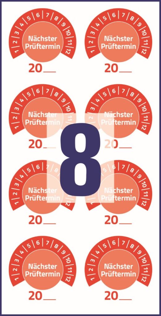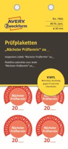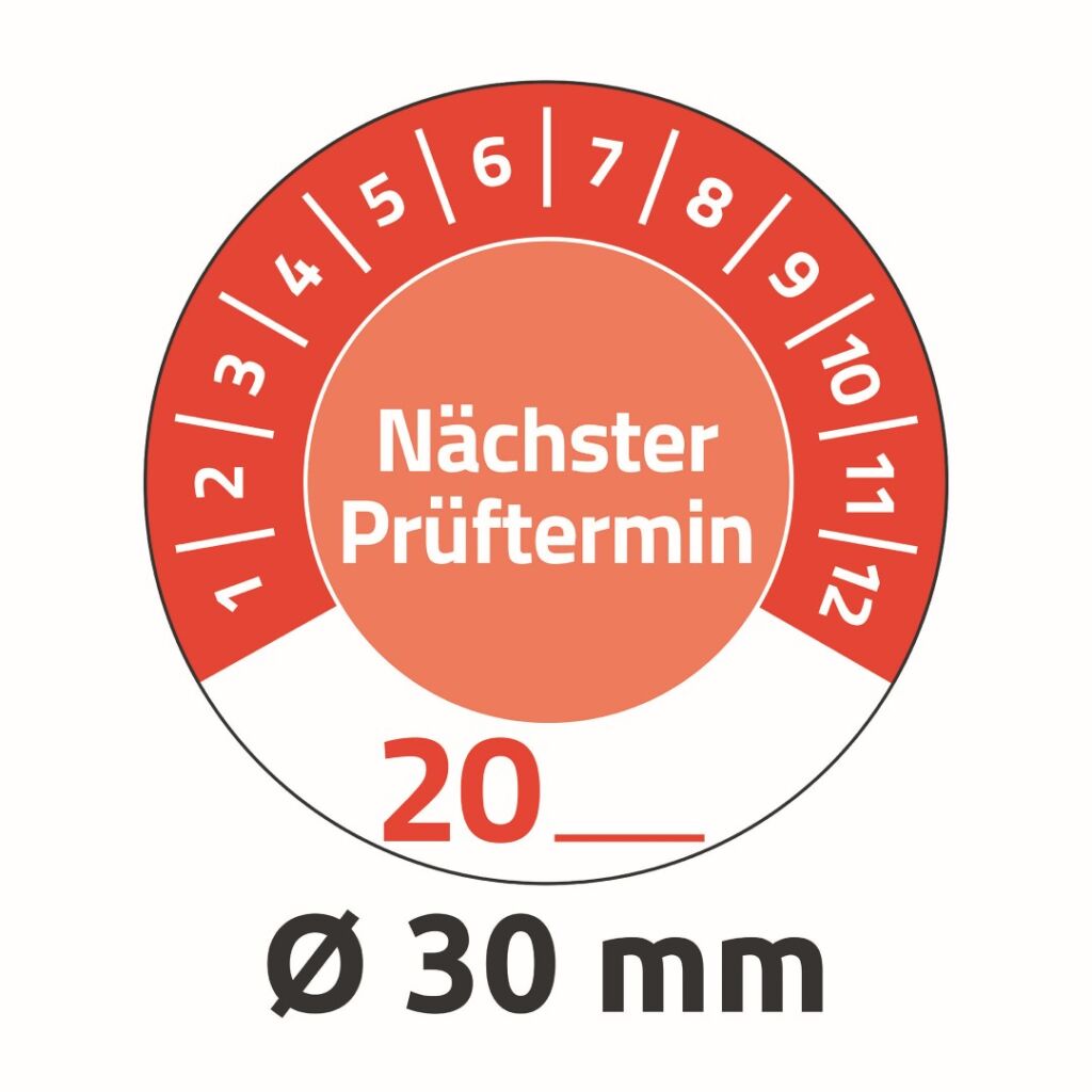 průměr 30 mm, 80 ks etiket v balení, vinylová fólie, permanentní lepidlo, barva červená s nápisem Nächster Prüftermin, číslicemi 1-12 a volitelným letopočtem 20xx.