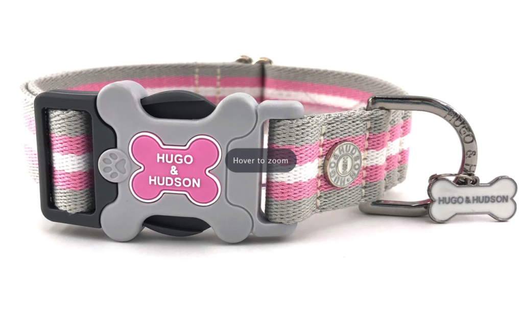 Klasický pruhovaný obojek Hugo & Hudson vypadá skvělé u každého plemene.  Kroužky D poskytují zvýšenou bezpečnost a přezky byly podrobeny zátěžové zkoušce až do 147 kg.
