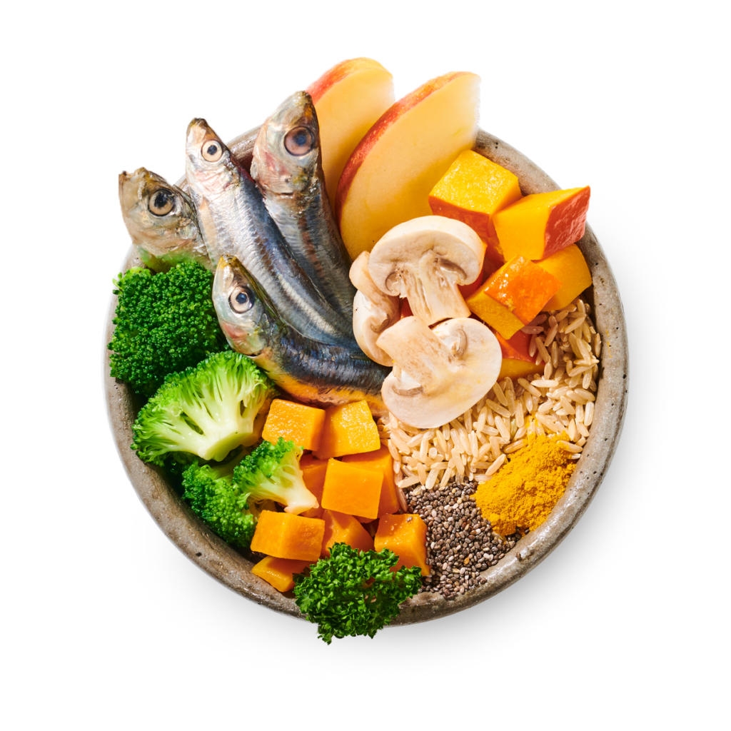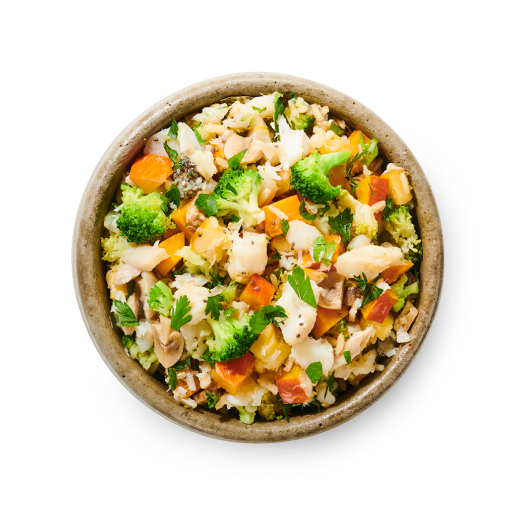 Rybu vaříme z celých kusů ryb -filetů, dle aktuální nabídky (60%), hnědá rýže (5%), brokolice, sladké brambory (10%), dýně (6%), jablka, žampiony, petržel, lososový olej, olivový olej, pivovarské kvasnice, chia a kurkuma.