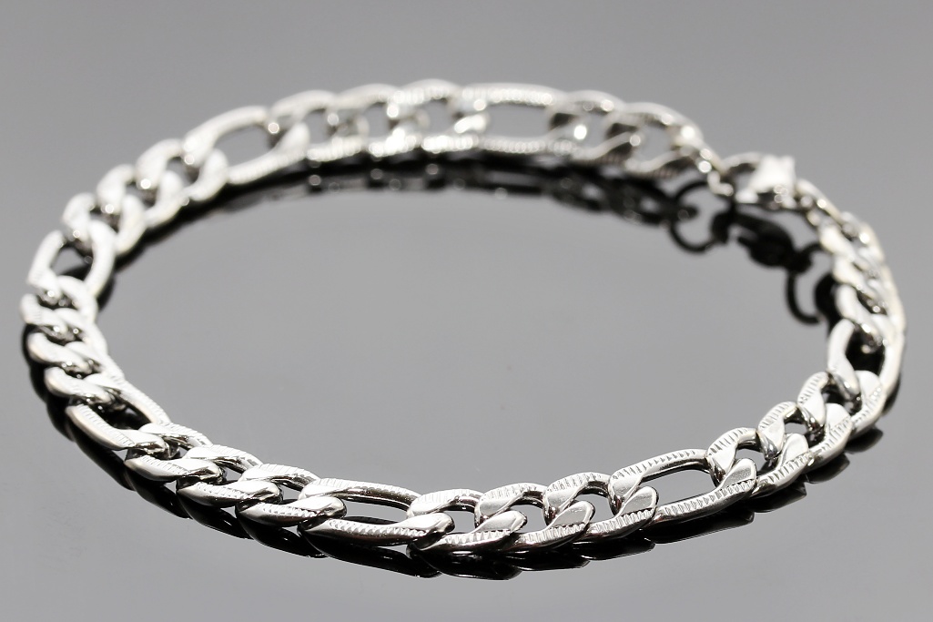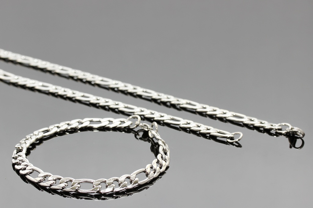 Řetízek 60cm, náramek 21cm, šířka 0,7cm, tloušťka 0,2cm Je tvořena kombinací tří malých oček a jednoho většího oválného očka. Zapínání na karabinku. Dárková krabička zdarma!