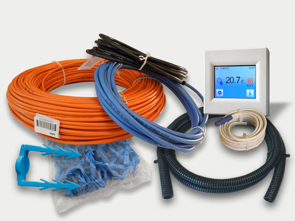 Sada CablePack pro instalaci podlahového topení do anhydritových a betonových podlah s jednožilovým topným kabelem, dotykovým termostatem a příslušenstvím.