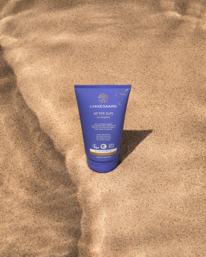Zklidňující gel po opalování LYKKEGAARD Cooling Kiss After Sun obsahuje certifikované organické složky, jako je aloe vera a extrakt z ovesných jader.