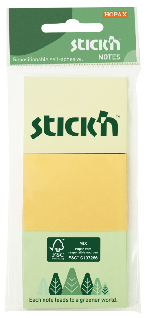Samolepící mini bločky Stick’n by Hopax s označením FSC™ COC jsou ze 100% vyrobeny z papíru s certifikátem FSC™, tedy v souladu se zásadami udržitelného lesního hospodářství, používají lepidlo na vodní bázi a obal produktu je dále recyklovatelný. Vhodné nejen na poznámky, psaní a kreslení, ale i pro kreativní tvoření. Lístky jdou velice snadno nalepit i odlepit a přesto bezpečně drží. Po odlepení nezanechávají na povrchu žádné stopy po lepidle. K dispozici také v mnoha dalších rozměrech, barvách a provedeních.