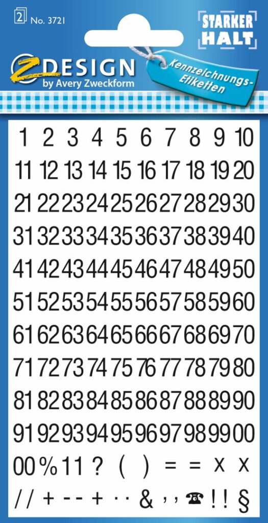 Potřebujete samolepicí písmena nebo číslice pro originální a osobité nápisy či vzkazy? Úhledný nápis můžete vytvořit snadno a rychle, a bez problémů nalepit na nejrůznější předměty a plochy. Spolehlivě lepí a vždy budou krásně čitelná. Jako léty osvědčený expert na etikety a samolepky nabízíme v sortimentu Z-design velký výběr samolepících písmen a číslic v různých provedeních a barvách. Samolepicí číslice Avery Zweckform 3721 nabízí prvotřídní a prověřenou kvalitu.