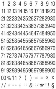 Typ písma: Condensed Helvetica 26 pt, výška 6,5 mm, 252 ks samolepek v balení, obdélníkový tvar, permanentní lepidlo, barva černá na bílé fólii. Balení obsahuje 2 stejné aršíky vyobrazených znaků a čísel od 1 do 99+00.