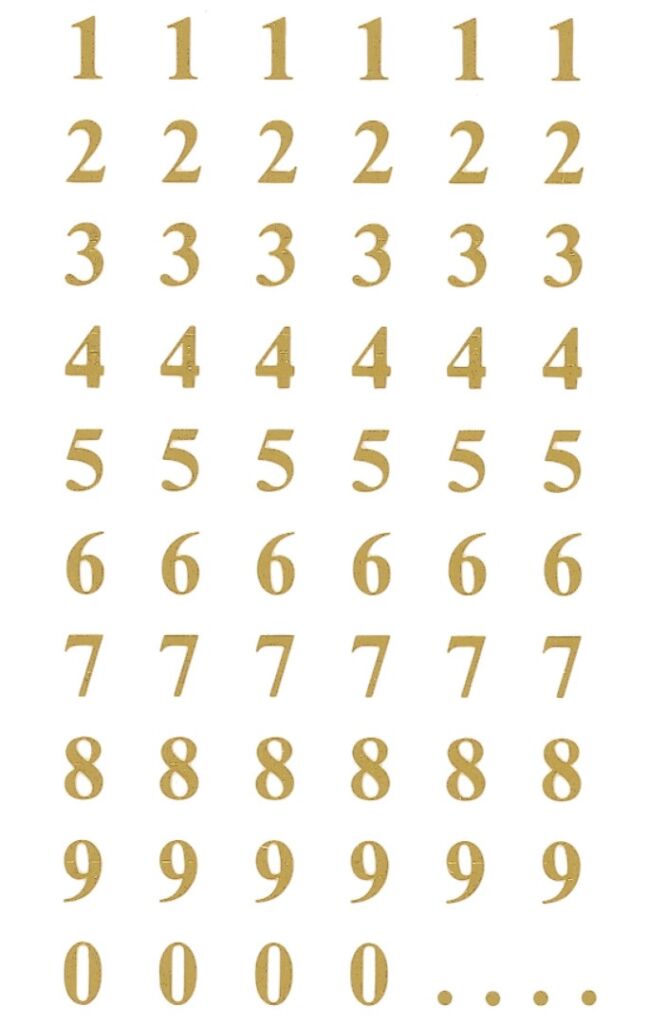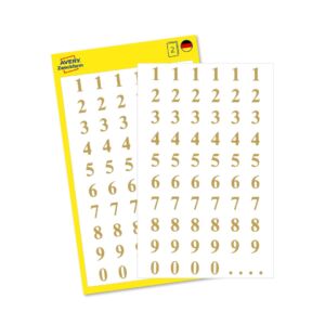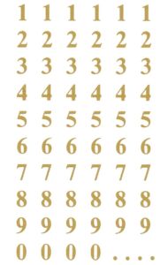 Typ písma: Times Bold 30pt, výška 7,5 mm, 124 ks samolepek v balení, obdélníkový tvar, permanentní lepidlo, barva zlatá na transparentní fólii. Balení obsahuje 2 stejné aršíky vyobrazených čísel od 0 do 9.