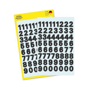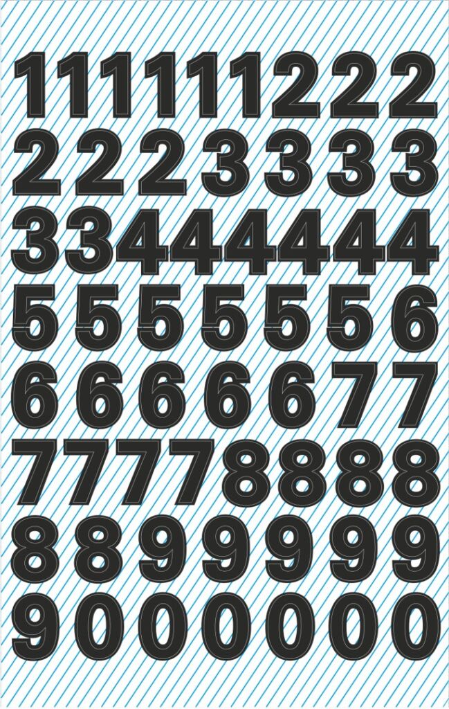 Typ písma: Univers Medium 38pt, výška 9,5 mm, 126 ks samolepek v balení, počasí odolná fólie, plnobarevný výsek, permanentní lepidlo, barva černá. Balení obsahuje 2 stejné aršíky vyobrazených čísel od 0 do 9.