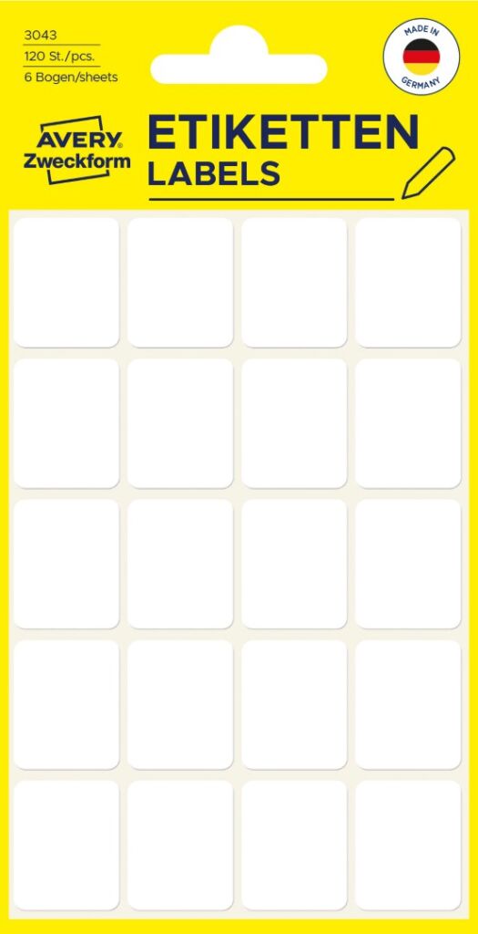 Samolepící etikety Avery Zweckform 3043 na jednoduché a přehledné značení nebo uspořádávání. Chcete rychle a jednoduše uspořádat a identifikovat složky na pracovním stole nebo si doma přehledně rozčlenit a označit nejrůznější dokumenty a nemáte zrovna přístup k tiskárně? Nabízíme Vám bílé samolepky o rozměru 22×18 mm, které snadno popíšete propiskou nebo fixem. Spolehlivě drží na všech běžných typech povrchů a můžete si vybrat ze široké škály rozměrů, v menších i větších baleních. Bílé samolepící štítky Avery 3043 jsou ideální pro rychlé a snadné použití doma nebo v kanceláři.