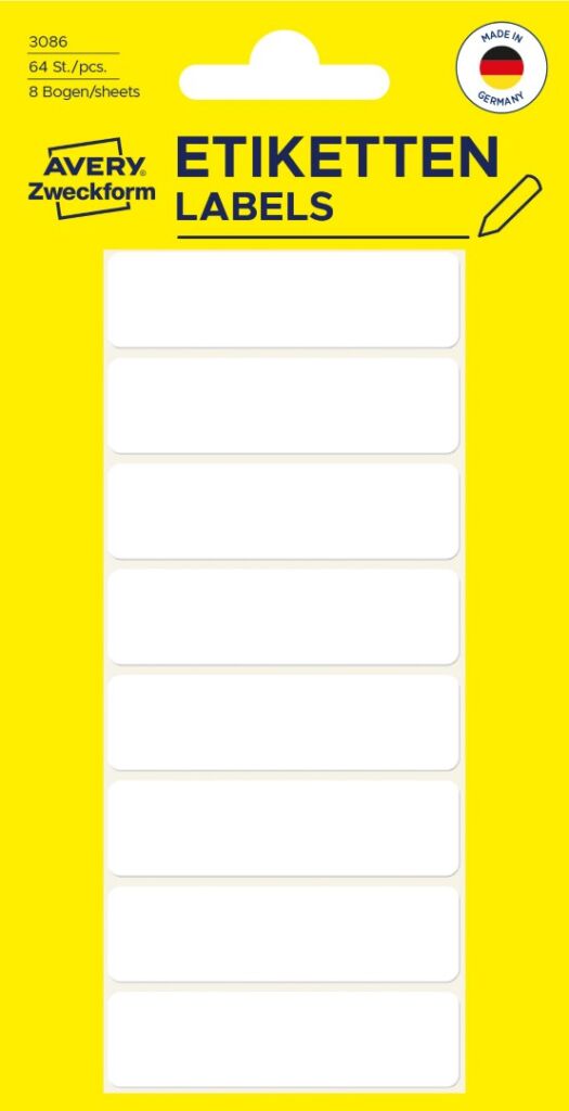 Samolepící etikety Avery Zweckform 3086 na jednoduché a přehledné značení nebo uspořádávání. Chcete rychle a jednoduše uspořádat a identifikovat složky na pracovním stole nebo si doma přehledně rozčlenit a označit nejrůznější dokumenty a nemáte zrovna přístup k tiskárně? Nabízíme Vám bílé samolepky o rozměru 50×14 mm, které snadno popíšete propiskou nebo fixem. Spolehlivě drží na všech běžných typech povrchů a můžete si vybrat ze široké škály rozměrů, v menších i větších baleních. Bílé samolepící štítky Avery 3086 jsou ideální pro rychlé a snadné použití doma nebo v kanceláři.